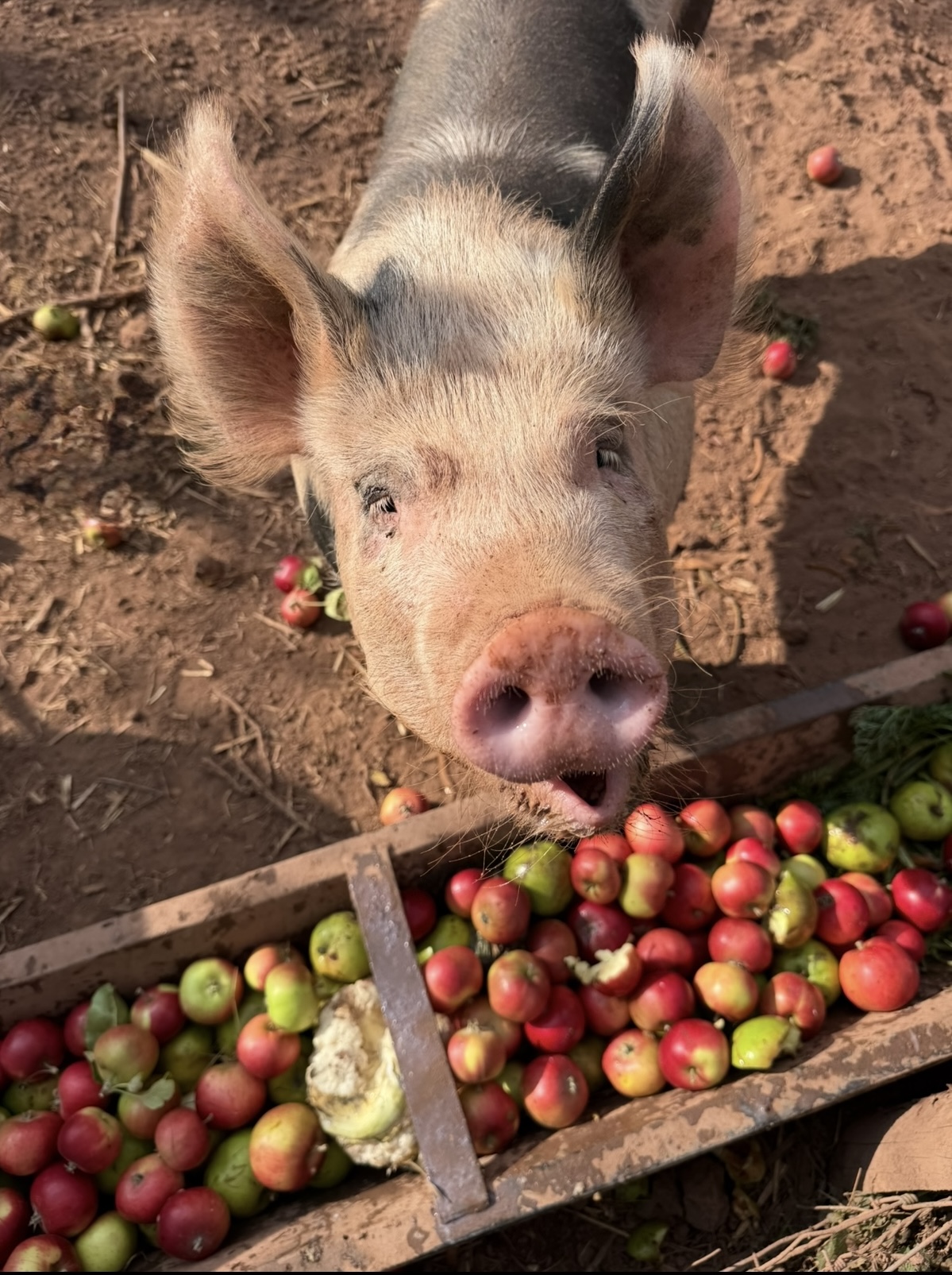 Our Berkshire x pigs are raised outdoors and have a varied diet including apples from the orchard!